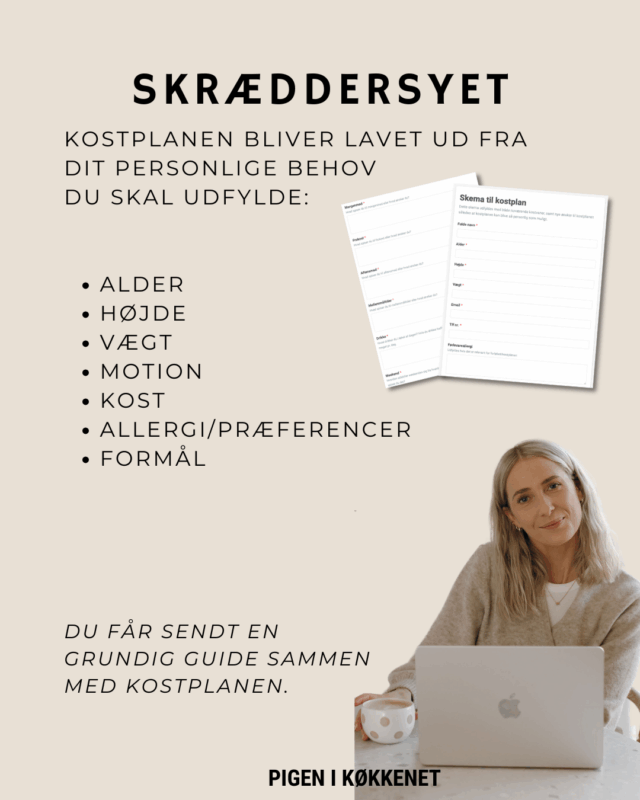 - Skræddersyet kostplan – du udfylder et skema, som din kostplan skræddersyes ud fra